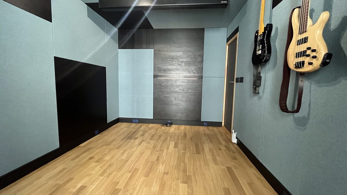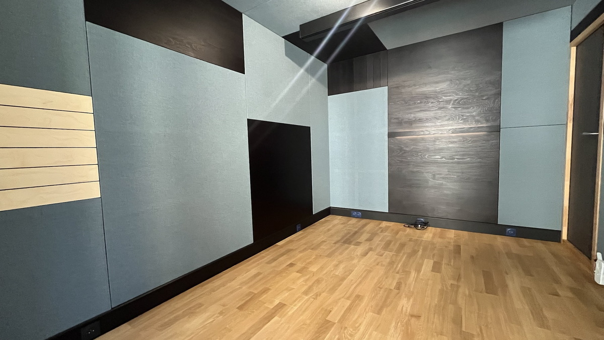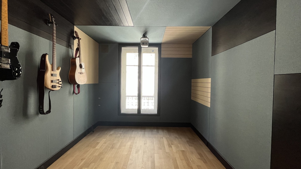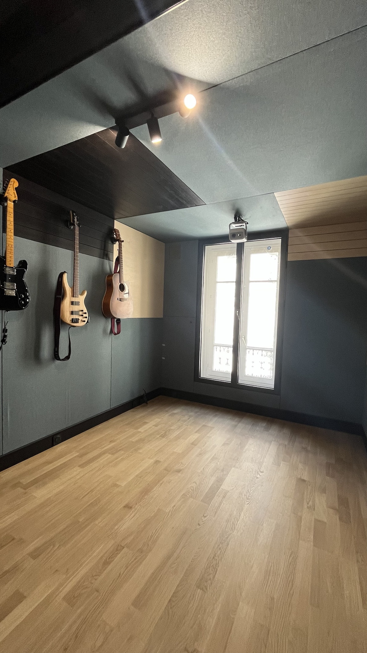 Surface nette : 17,4 m² Sur ces photos : restaient quelques finitions (plinthes, appareillages électriques, ...) mais c'est en très bonne voie ! ======= A recently completed rehearsal and recording studio in Paris 11