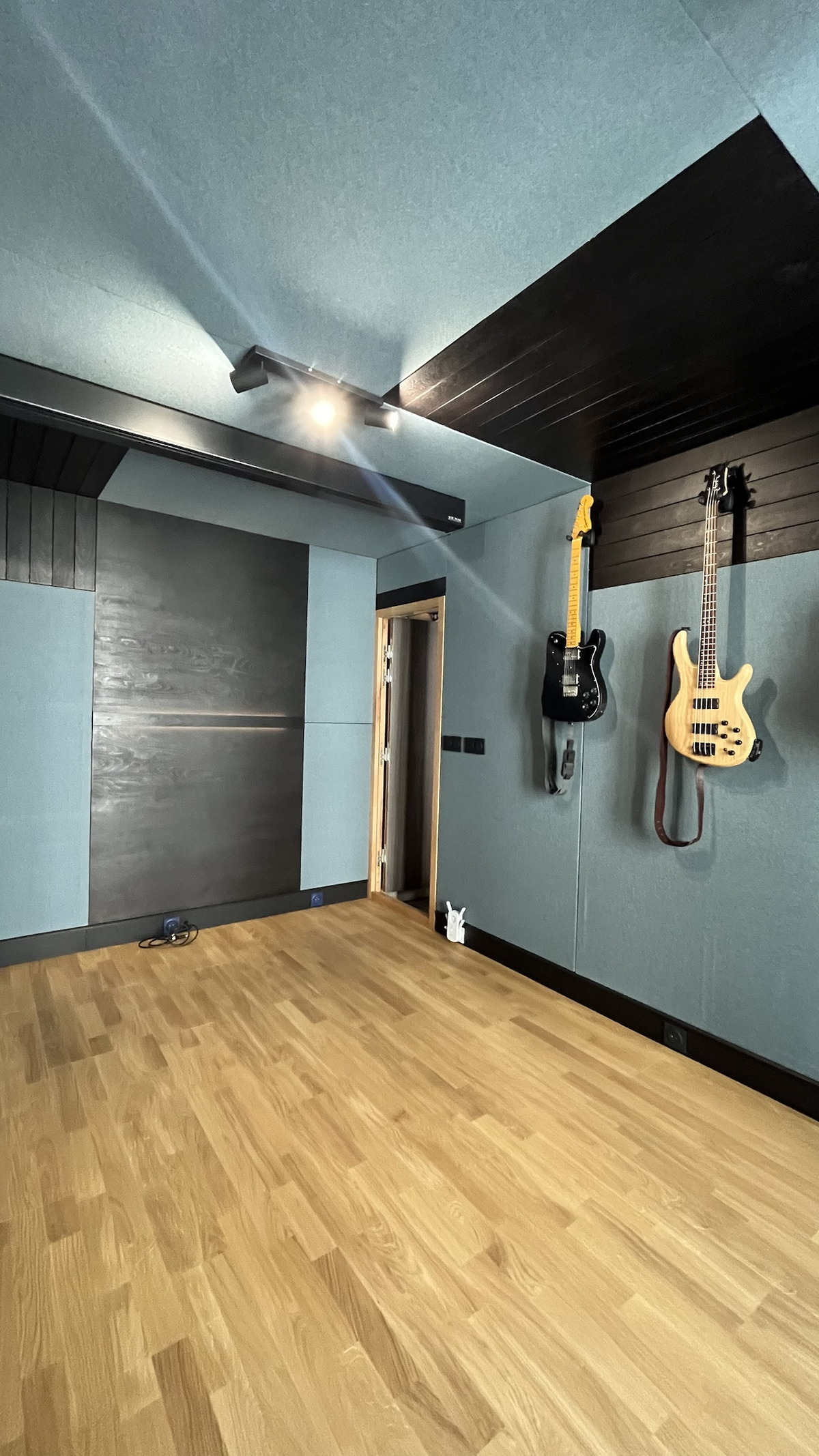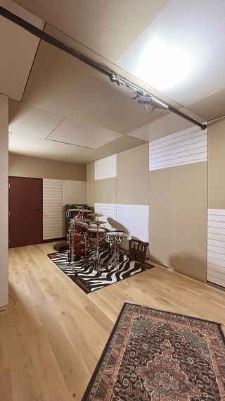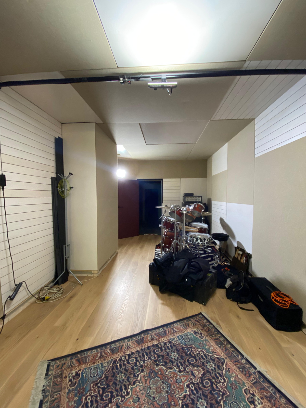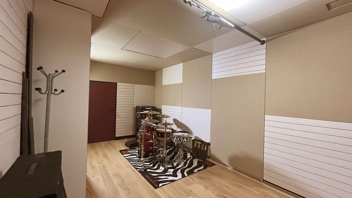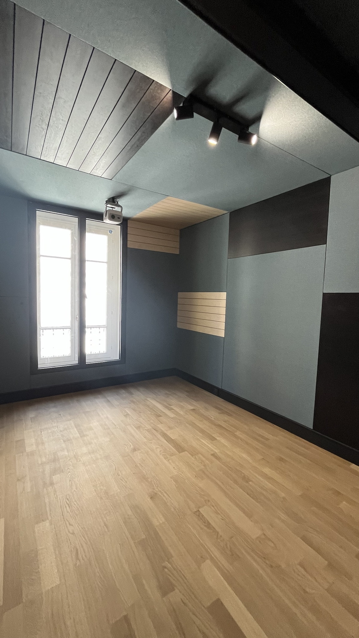 2018 - Studio de répétition et d'enregistrement - PantinEtude et réalisation complète : création d'un studio d'enregistrement et de répétition. Surface brute 44 m2. Structure désolidarisée de type "boite dans la boite", ventilation insonorisée, câblage secteur et audio, traitement acoustique mural et habillage par toile tendue, traitement acoustique de plafond par panneaux AcoustiPanel. Scène désolidarisée par plots antivibratiles.