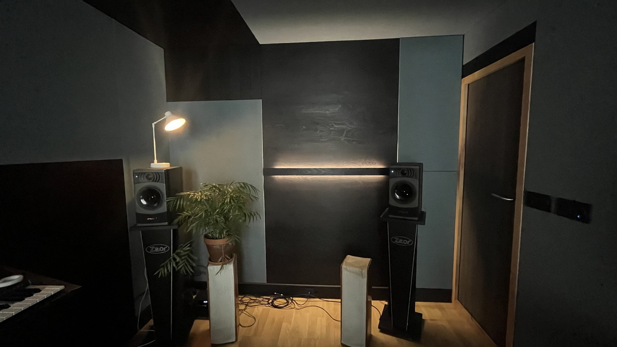 Traitement acoustique home studio 2Traitement acoustique d'un home studio par installation de panneaux Damiacoustic. La hauteur sous plafond était limitée. Cela a conduit par exemple à la mise en oeuvre de panneaux Damiacoustic 25 directement fixés au plafond. Un traitement renforcé des ondes stationnaires a été mis en uvre par la construction d'un mur absorbant derrière les enceintes. |